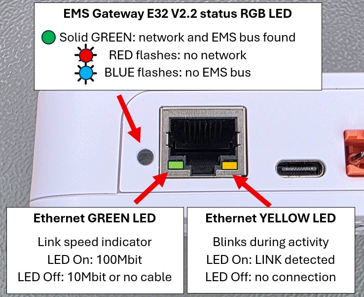 The Gateway has a status indicator LED left of the LAN port. All E32 V2 Gateways until summer 2025 have a blue status LED. Most E32 V2 Gateways from summer 2025 onwards have a multi-color RGB LED.